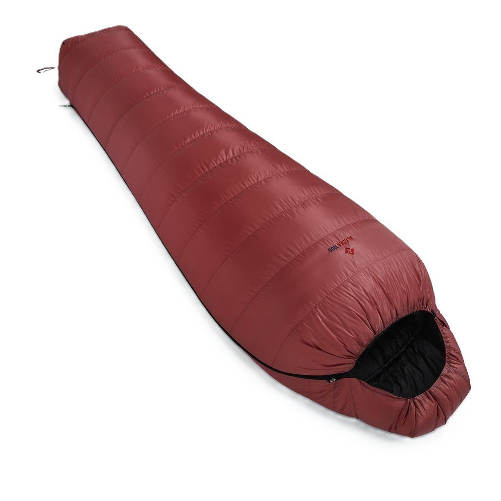 The 1,100 grams of 700 cuin Polish duck down filling provides pleasant warmth. The H-shaped double chamber construction is ideal for extreme cold. It prevents thermal bridges and allows the down to expand fully. The upper chambers are filled more than the lower ones, which are compressed when you lie down. For added protection, the Alaska has an adjustable hood, a removable collar, a fitted mummy shape and protection along the entire length of the zip.