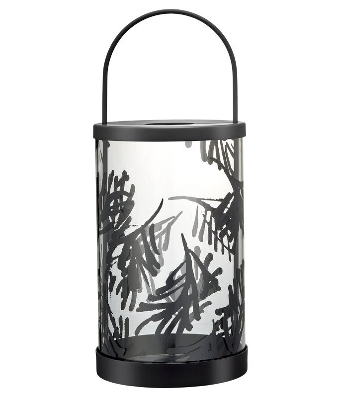 The Conifer 37 cm lantern is a candle lantern designed by Teemu Järvi, whose graphic work is directly inspired by Nordic forests. The conifer pattern printed on the glass creates a soft, warm glow when the flame is lit.